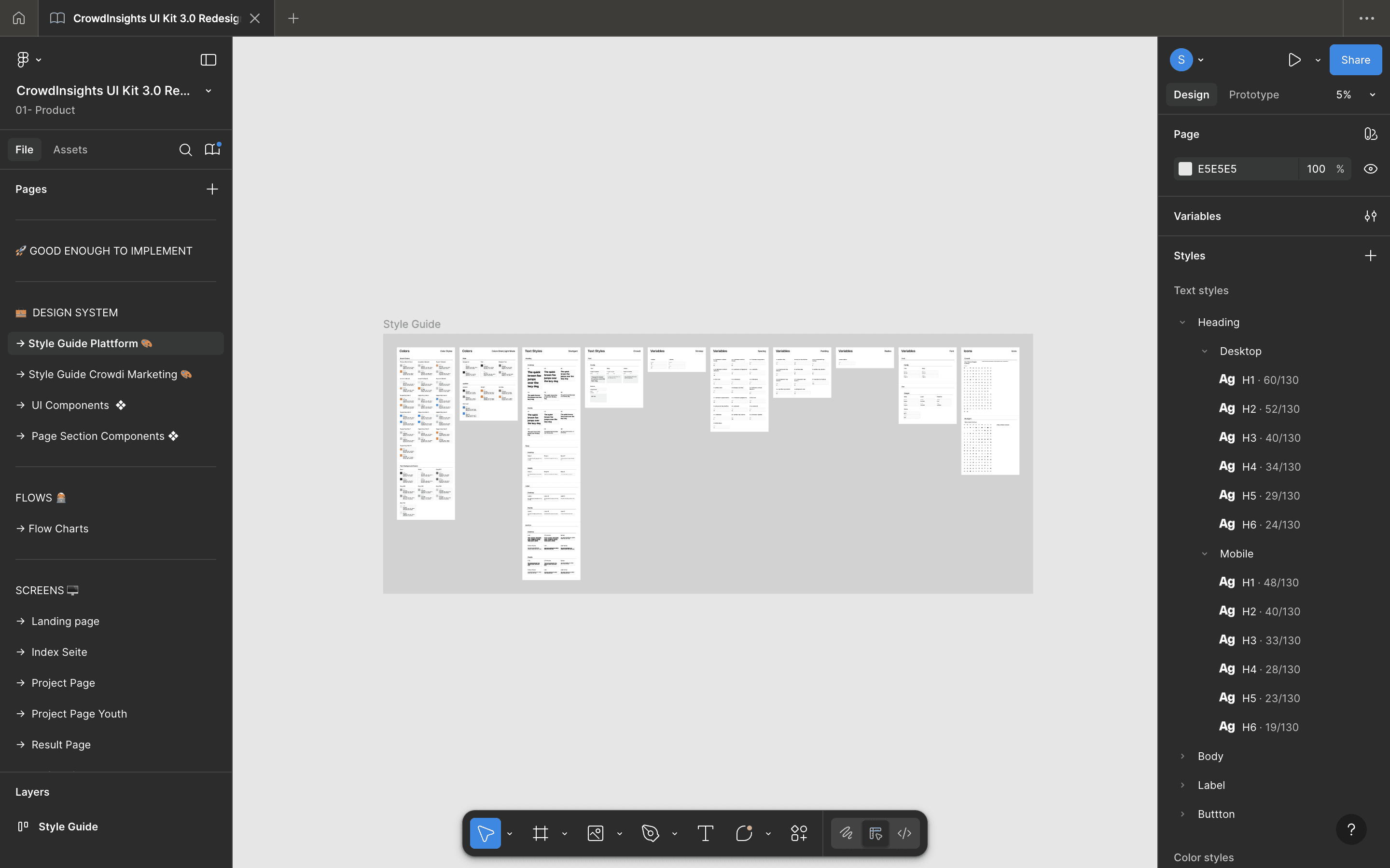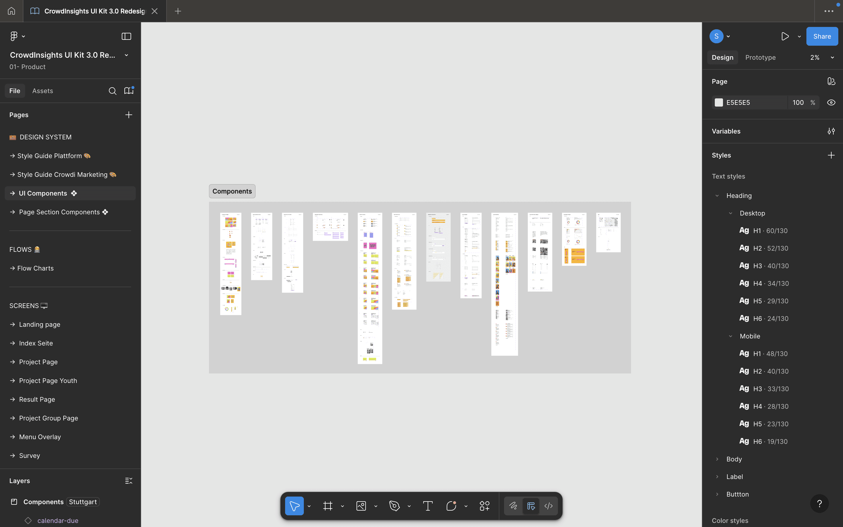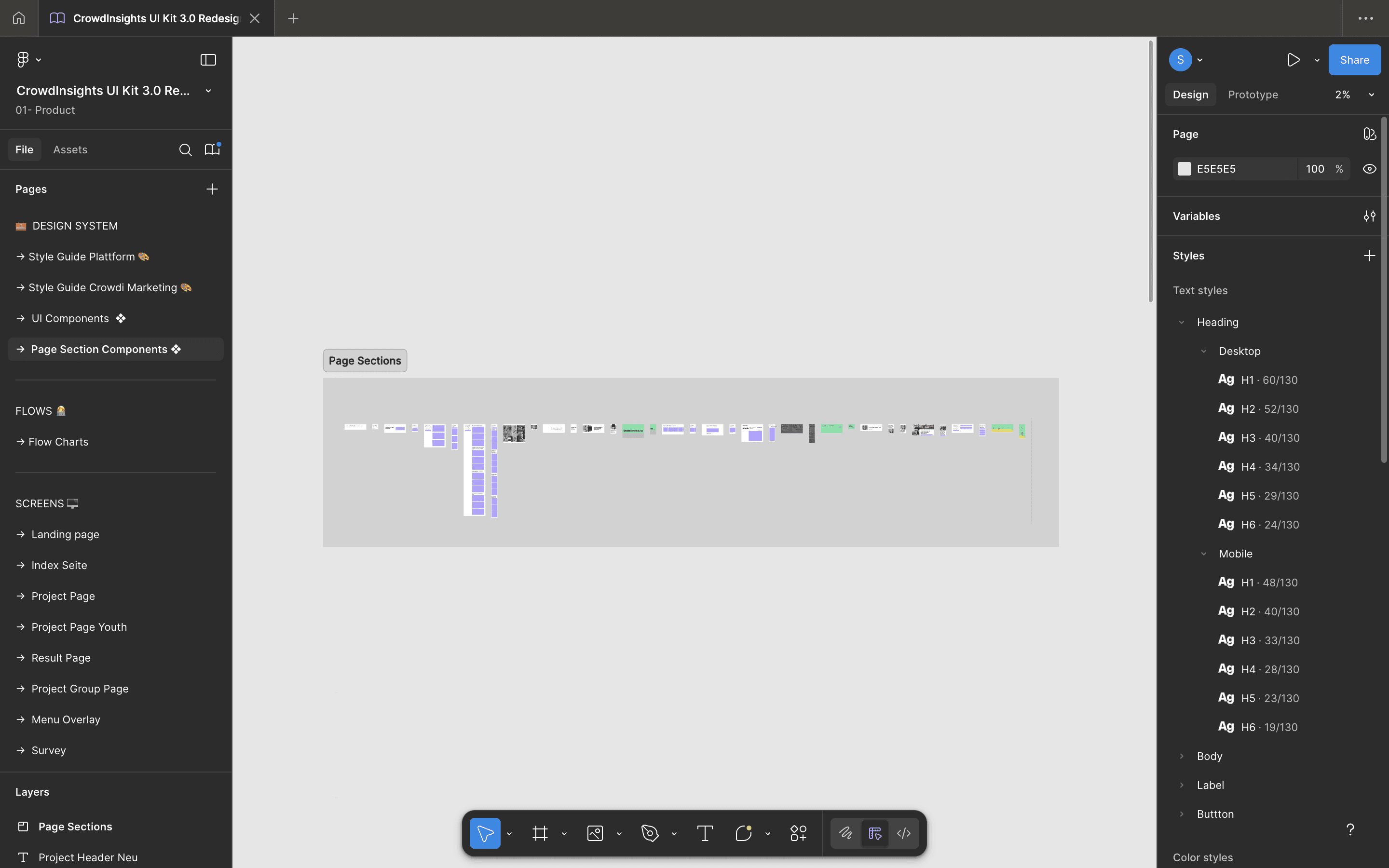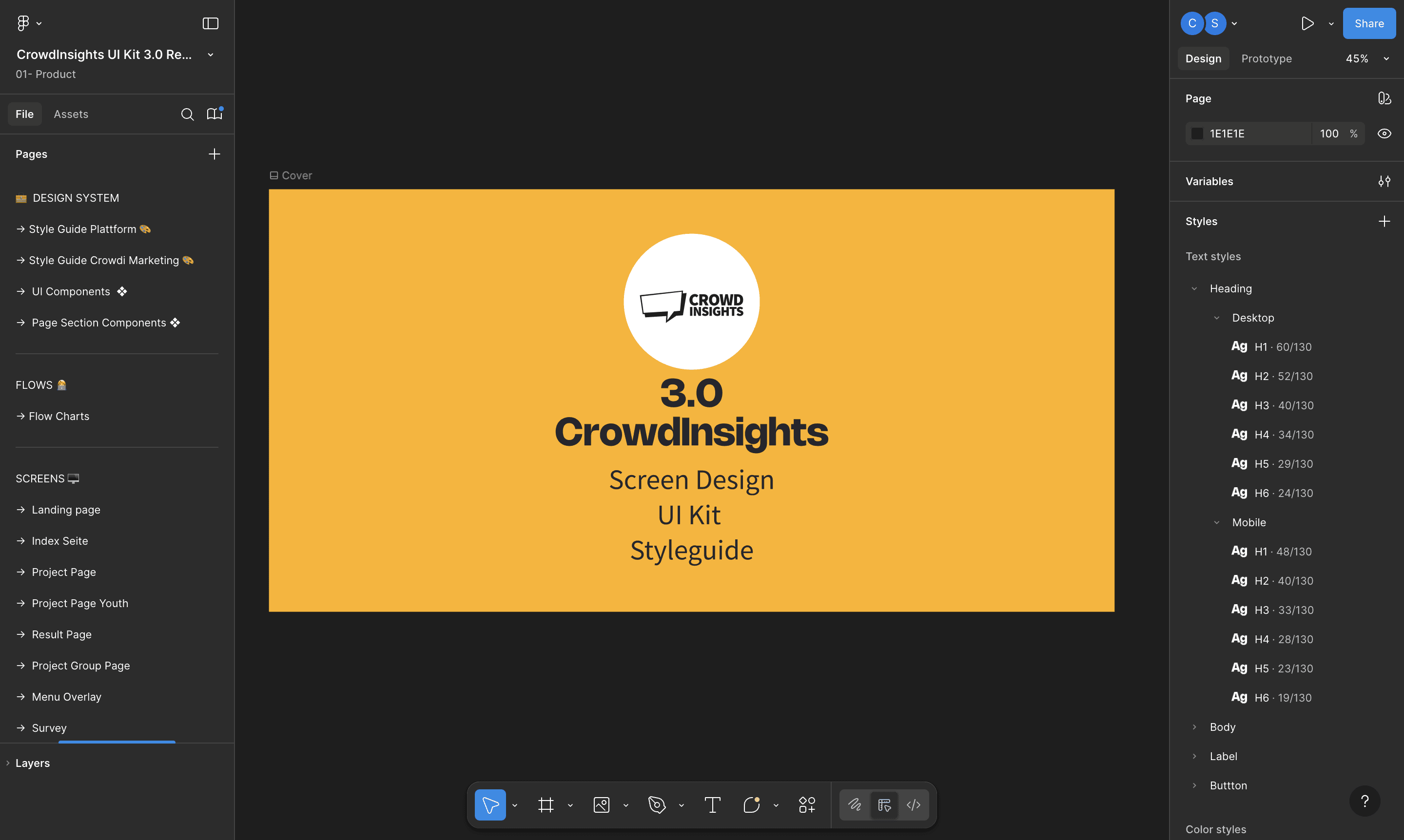The entire redesign lives inside one unified Figma workspace, structured into three main chapters to keep design, logic, and implementation tightly aligned: Design System, User Flows and Screens.