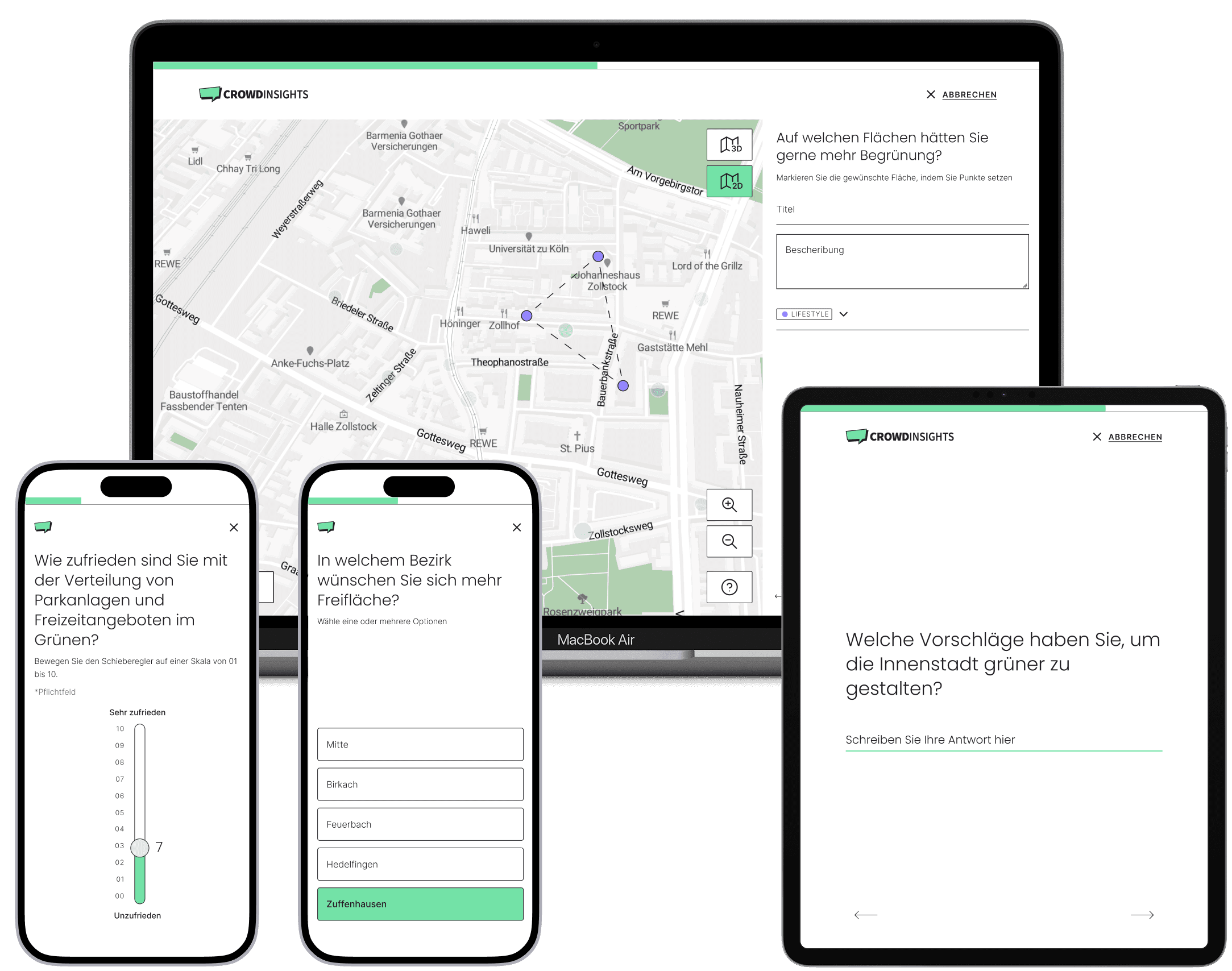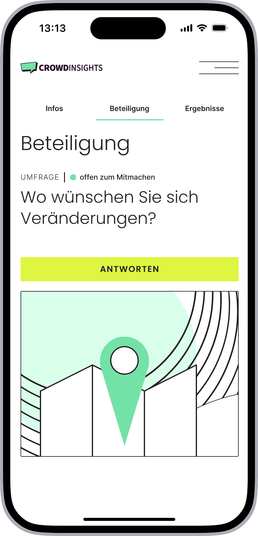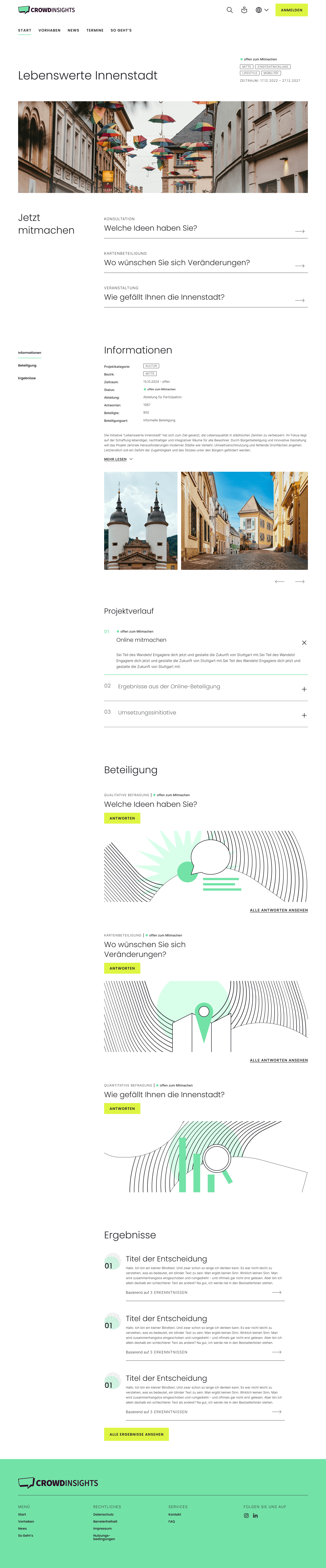 CrowdInsights is a scalable participation platform enabling municipalities to manage complex civic engagement. It is used to involve citizens in urban planning processes, idea submissions and public discussions.