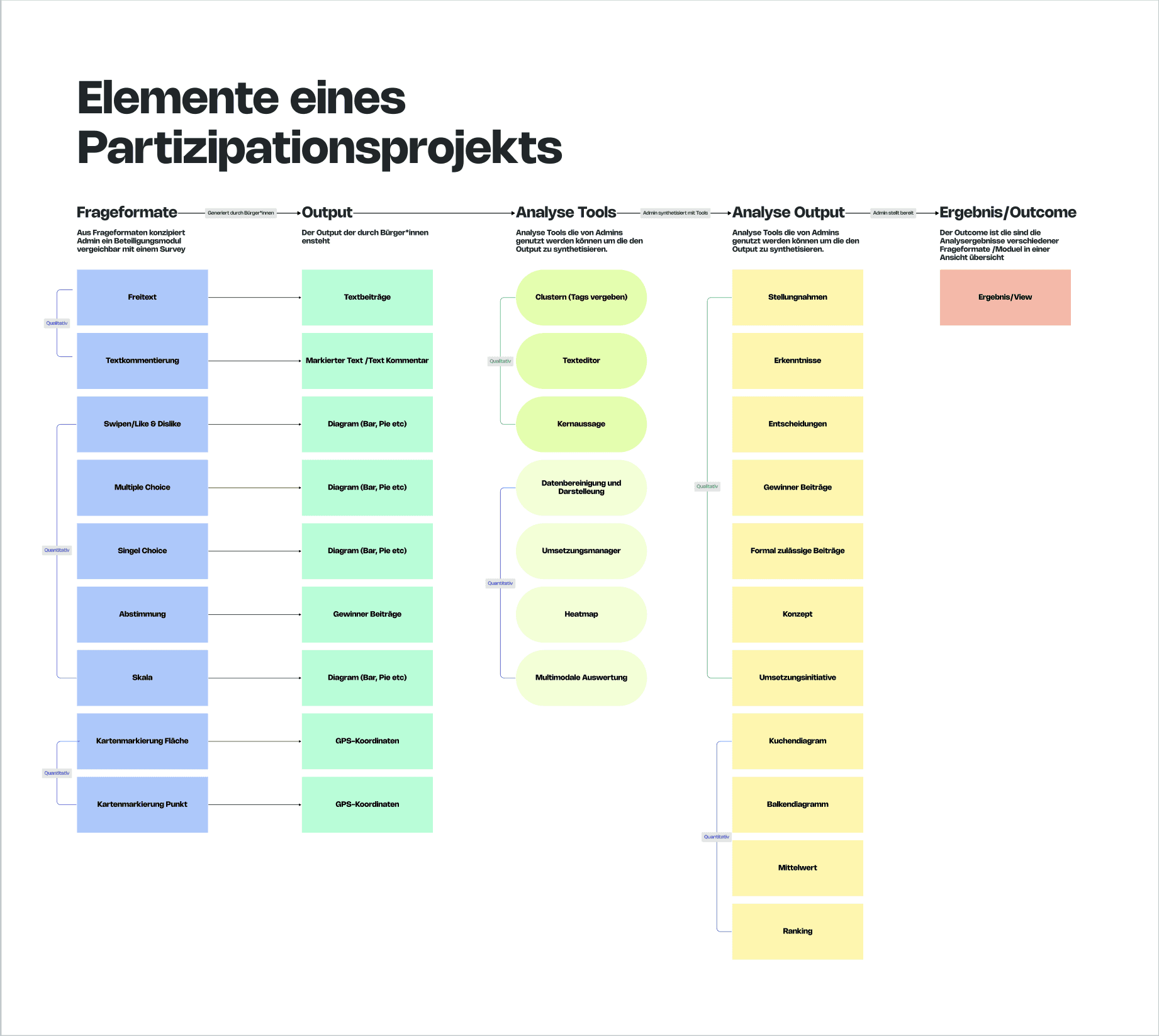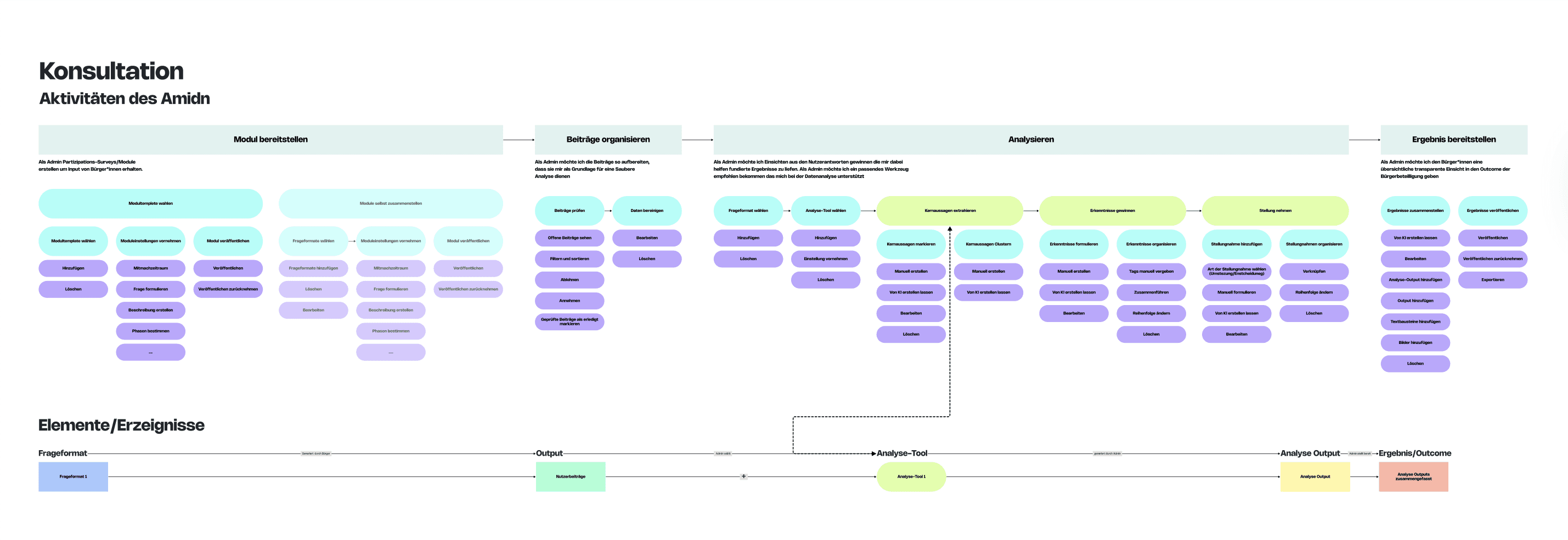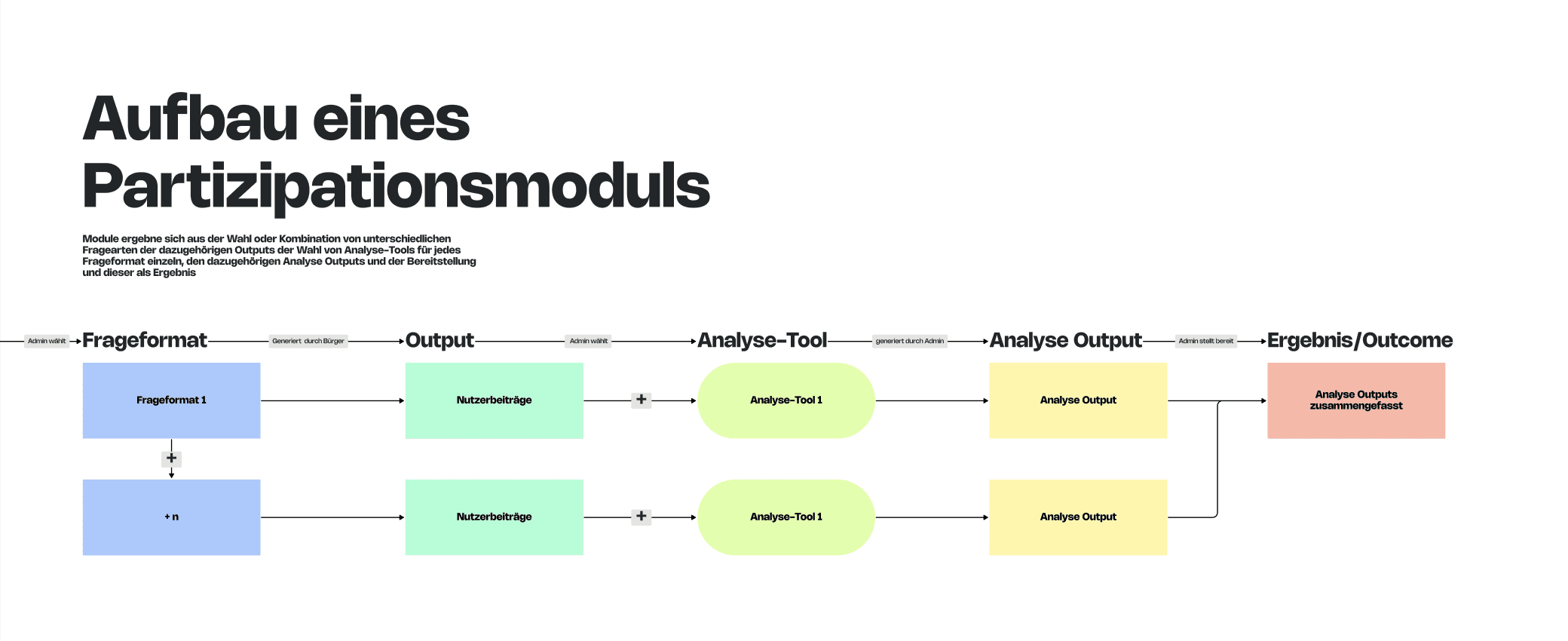 Developing a unified participation logic and defining reusable templates and building blocks for both admin configuration and citizen interactionUser journey mapping Mapping user journeys across all participation modules to validate that the modular system holds up across different formats and use cases.