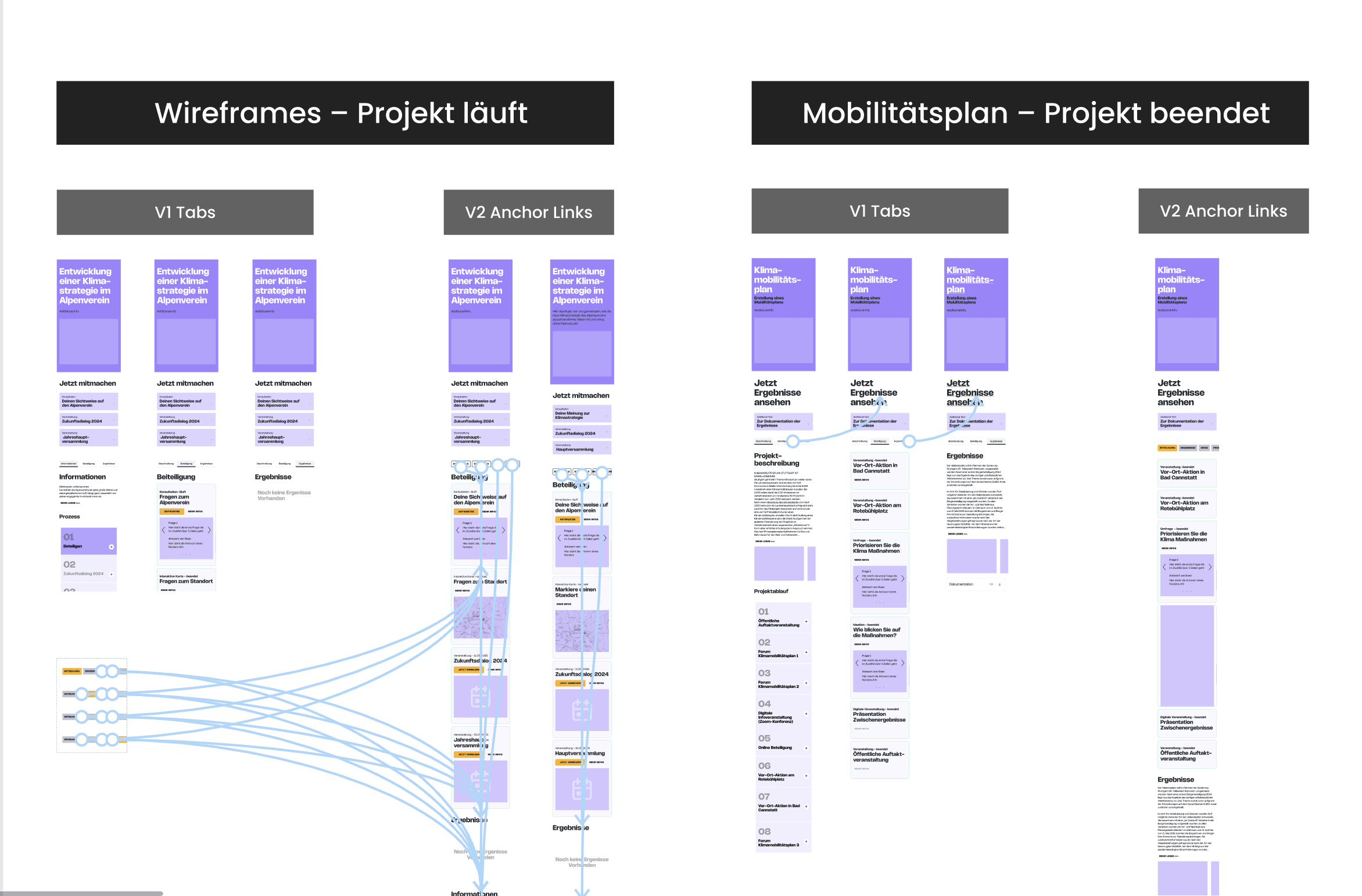 Exploring different structural approaches and interaction patterns, including navigation concepts (e.g. anchor-based vs tab-based)High-fidelity prototypes